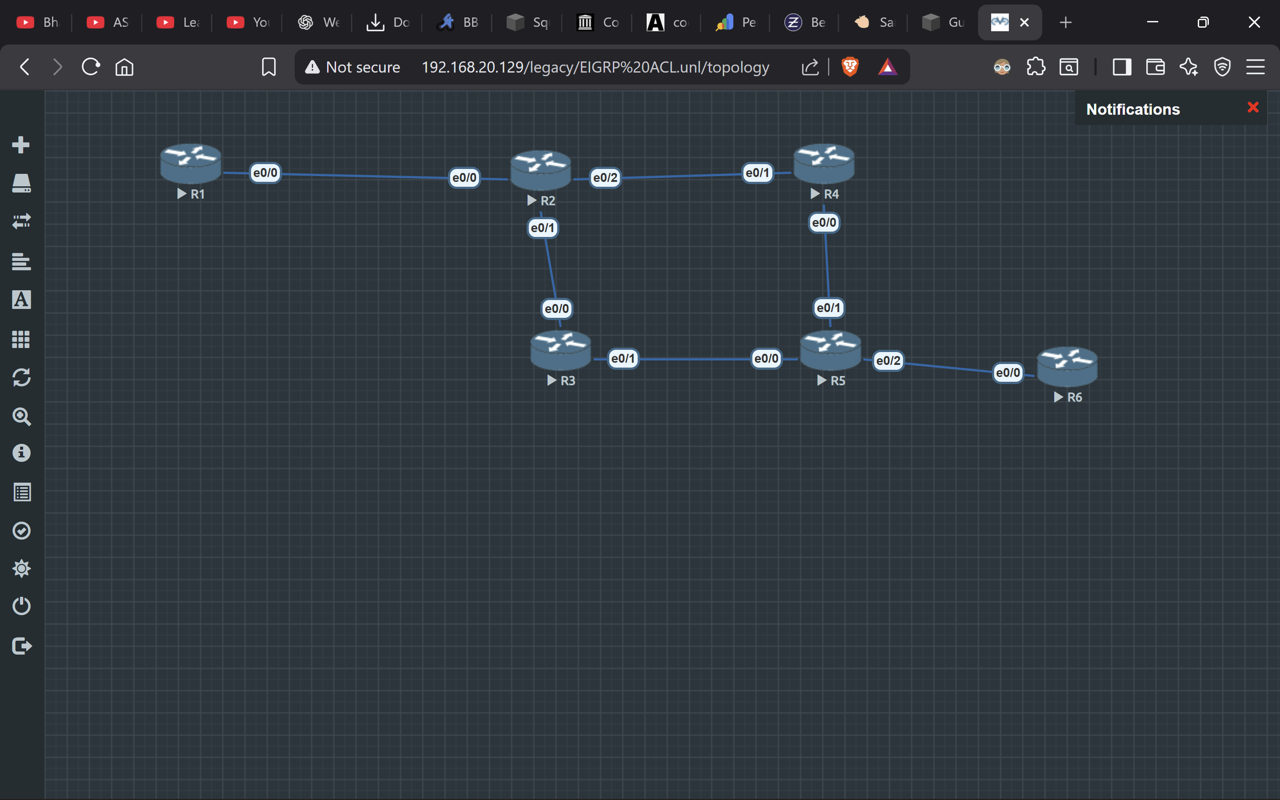 In this lab, we will configure a 6-router EIGRP topology, apply path control using delay, configure summarization, and perform route filtering using ACL + distribute-list.